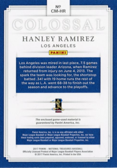 2017 Panini National Treasures Hanley Ramirez#CM-HR - #/99 Colossal Patch Dodgers
