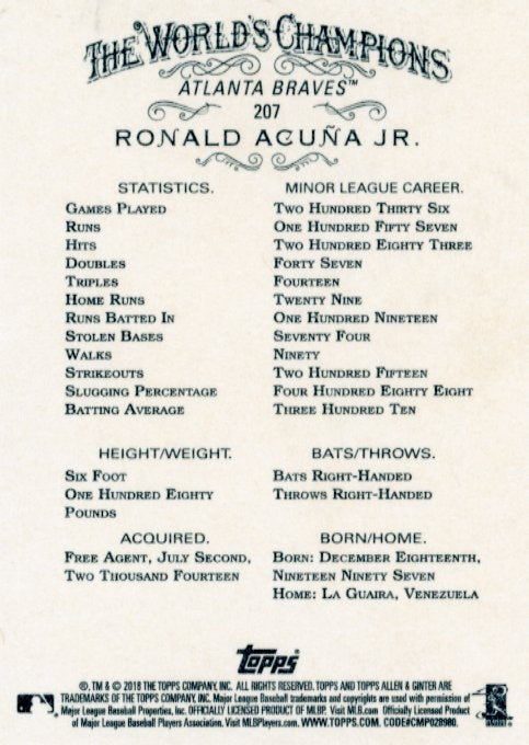 2018 Topps Allen and Ginter Ronald Acuna Jr. RC #207 - Braves