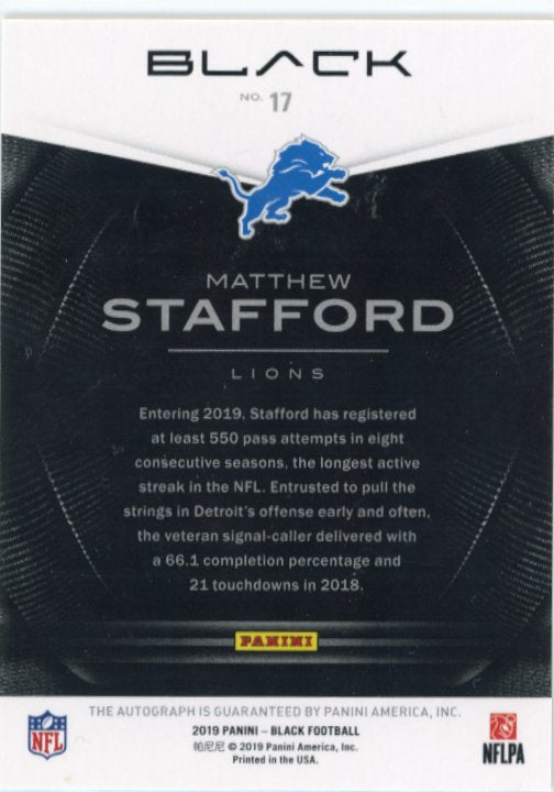 2019 Panini Black Matthew Stafford #17 - Autograph #/7 Lions