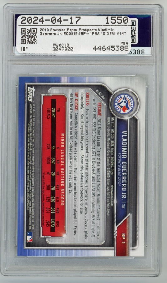 2019 Bowman Vladimir Guerrero Jr. #BP-1 - PSA 10 Blue Jays