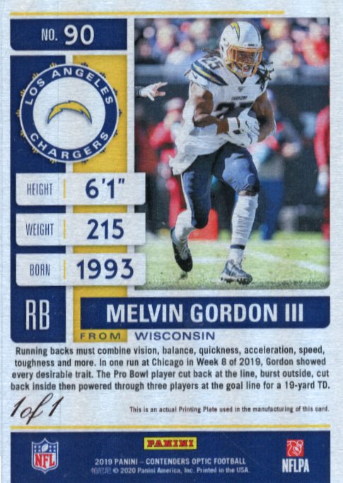 2019 Panini Contenders Melvin Gordon III #90 - 1/1 PRINTING PLATE Chargers