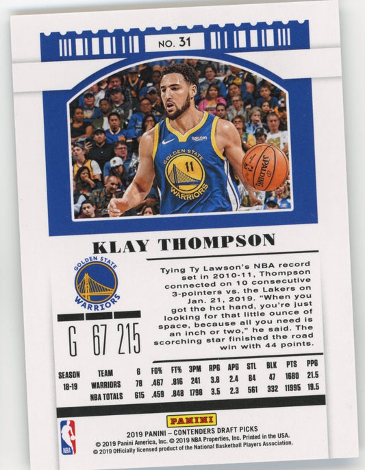 2019 Panini Contenders Klay Thompson Season Ticket #31 - #/10 Blue Squares Warriors