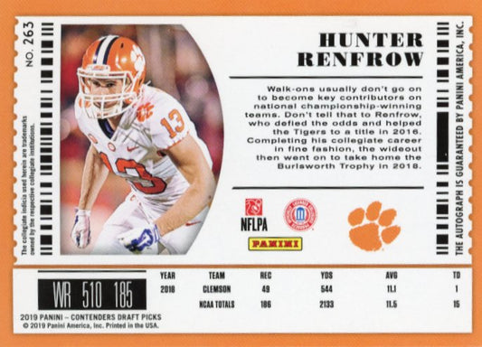 2019 Panini Contenders Draft Picks Hunter Renfrow College Ticket RC #263 - Autograph Clemson