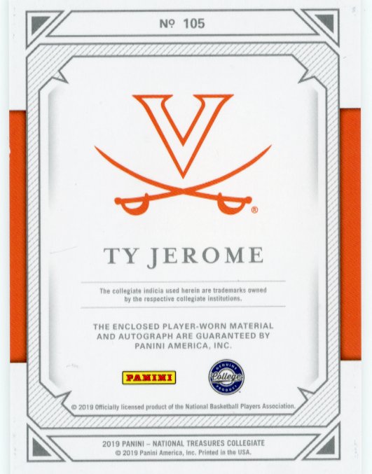 2019 Panini National Treasures Ty Jerome Rookie RC #105 - Patch Autograph #/99 Cavaliers