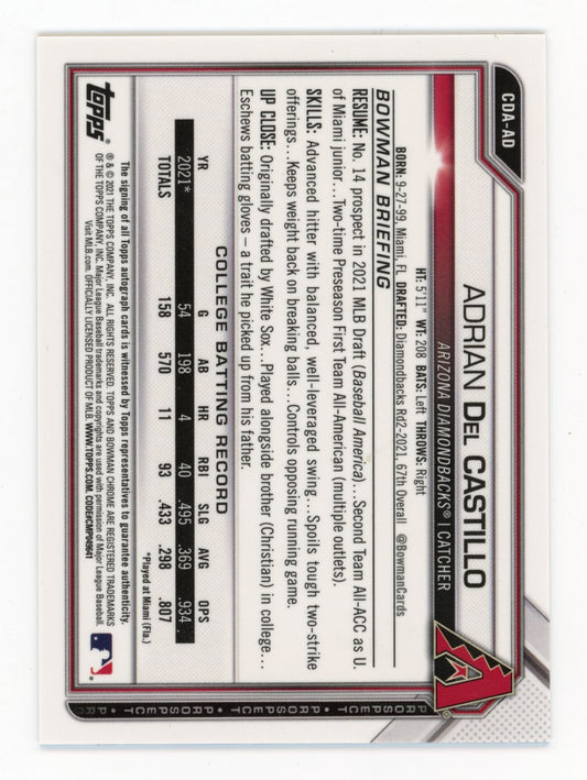 2021 Bowman Chrome Adrian Del Castillo 1st Bowman #CDA-AD - #/250 Purple Autograph Diamondbacks