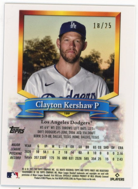 2021 Topps Finest Clayton Kershaw #189 - Black #/25 Dodgers