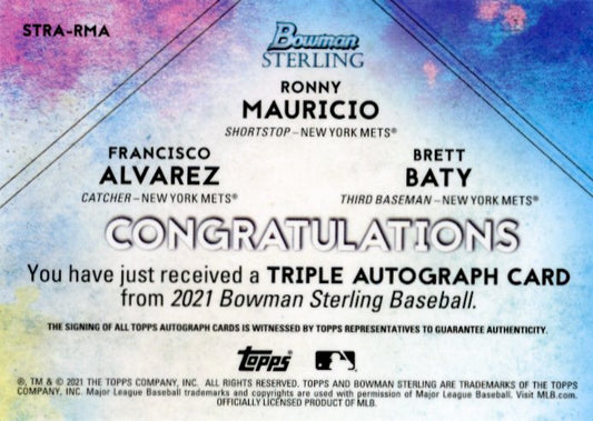 2021 Topps Bowman Sterling Ronny Mauricio Francisco Alvarez Brett Baty #STRA-RMA - Triple Autograph Mets
