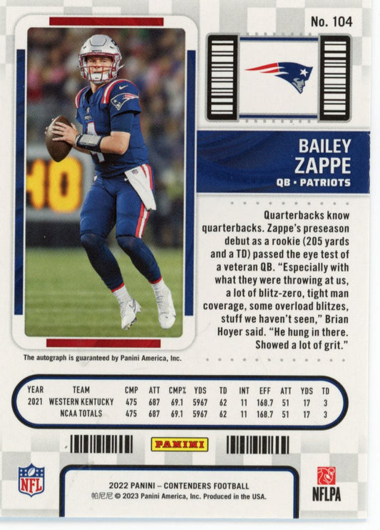 2022 Panini Contenders Bailey Zappe Rookie Ticket RC #104 - Autograph Red Zone Patriots