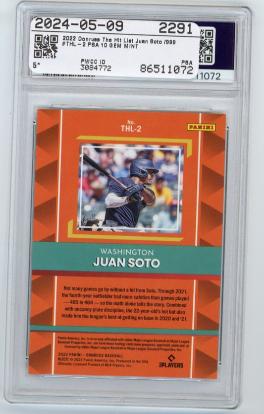 2022 Panini Donruss Juan Soto The Hit List #THL-2 - #/999 PSA 10 Nationals