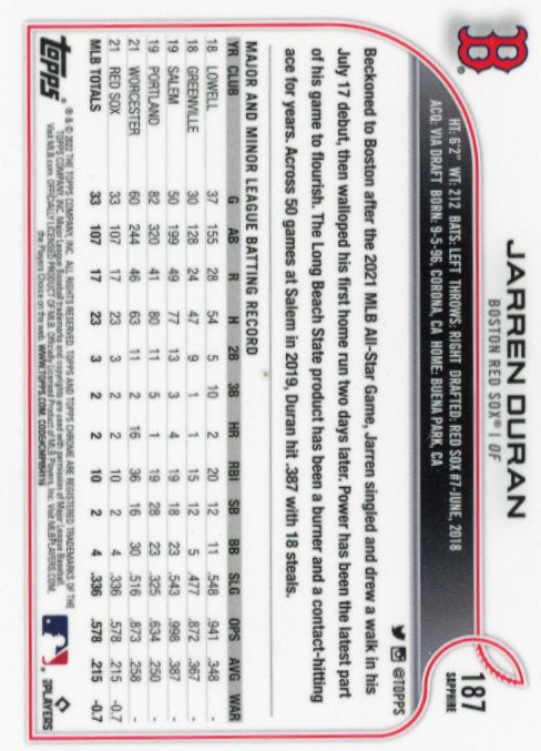 2022 Topps Chrome Sapphire Jarren Duran RC #187 - Red Sox