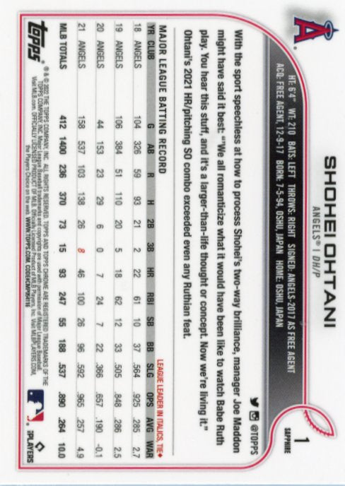 2022 Topps Chrome Sapphire Shohei Ohtani #1 - Dodgers
