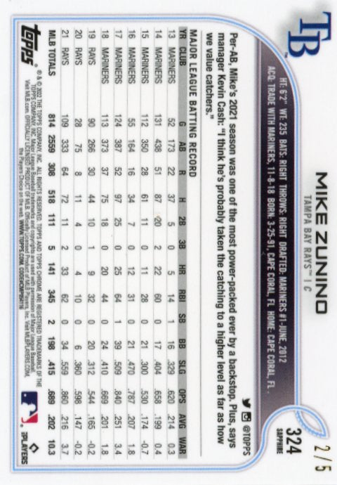 2022 Topps Chrome Sapphire Mike Zunino #324 - Red Cracked Ice #/5 Rays