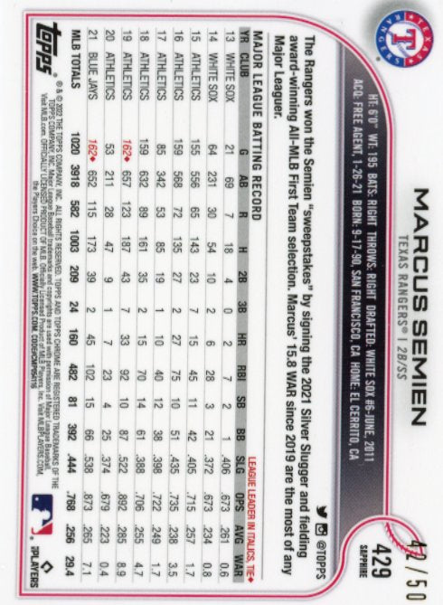 2022 Topps Chrome Sapphire Marcus Semien #429 - Gold Cracked Ice #/50 Blue Jays