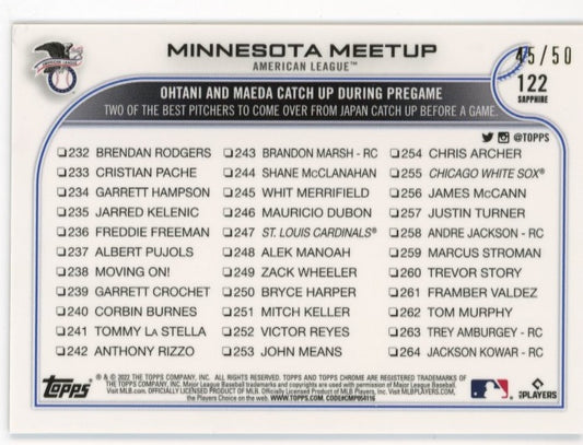 2022 Topps Chrome Sapphire Shohei Ohtani Kenta Maeda Minnesota Meetup #122 - #/50 Gold Cracked Ice Angels Twins