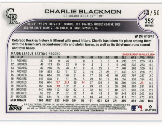 2022 Topps Chrome Sapphire Charlie Blackmon #352 - #/50 Gold Rockies