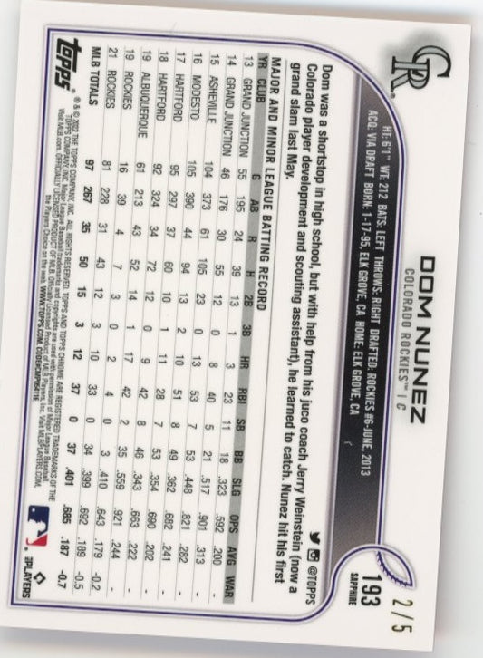 2022 Topps Chrome Sapphire Dom Nunez #193 - #/5 Red Rockies