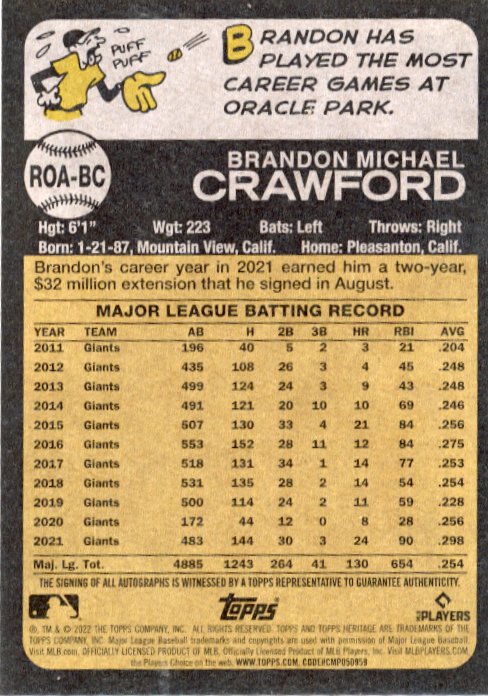 2022 Topps Heritage Brandon Crawford #ROA-BC - Autograph Giants