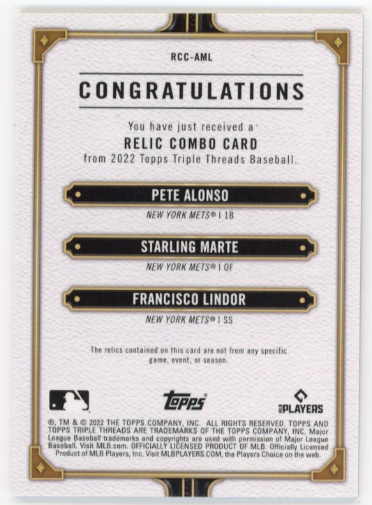 2022 Topps Triple Threads Pete Alonso Starling Marte Francisco Lindor #RCC-AML - Triple Relic #/36 Mets