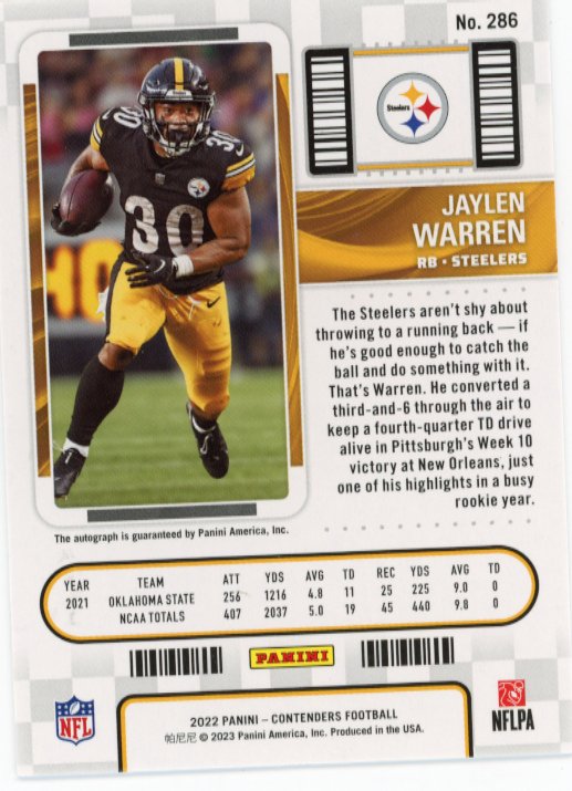 2022/23 Panini Contenders Jaylen Warren RC - Autograph #289 Steelers