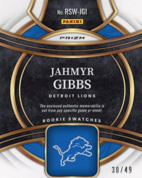 2023 Panini Select Jahmyr Gibbs Rookie RC #RSW-JGI - Patch #/49 Lions