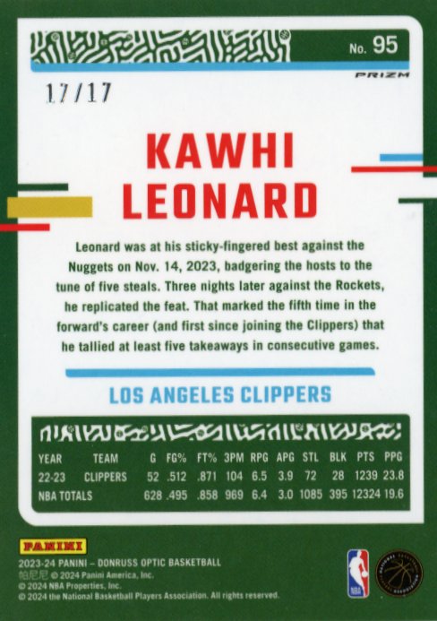 2023/24 Panini Donruss Optic Kawhi Leonard #95 - Purple Stars #/17 Clippers