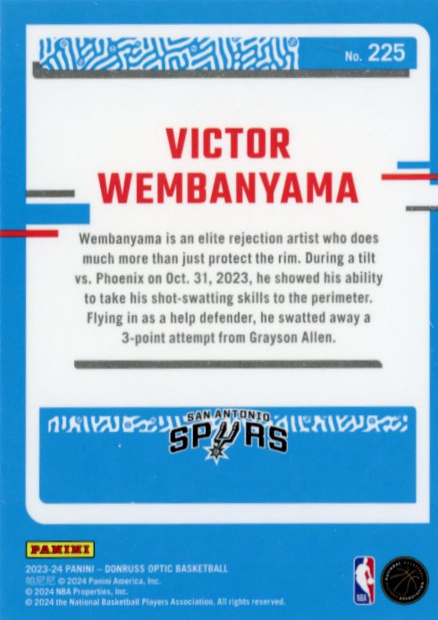 2023/24 Panini Donruss Optic Victor Wembanyama Rated Rookie RC #225 - Spurs