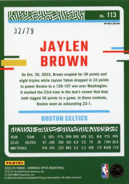 2023/24 Panini Donruss Optic Jaylen Brown #113- Pink #/79 Celtics