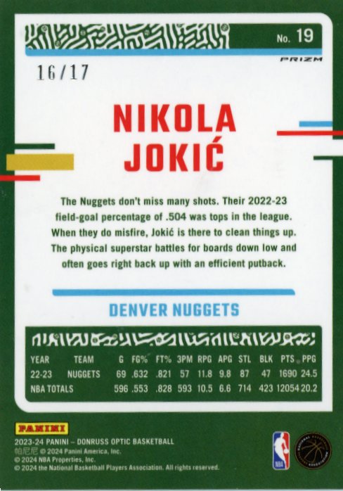2023/24 Panini Donruss Optic Nikola Jokic #19 - #/17 Purple Stars Nuggets