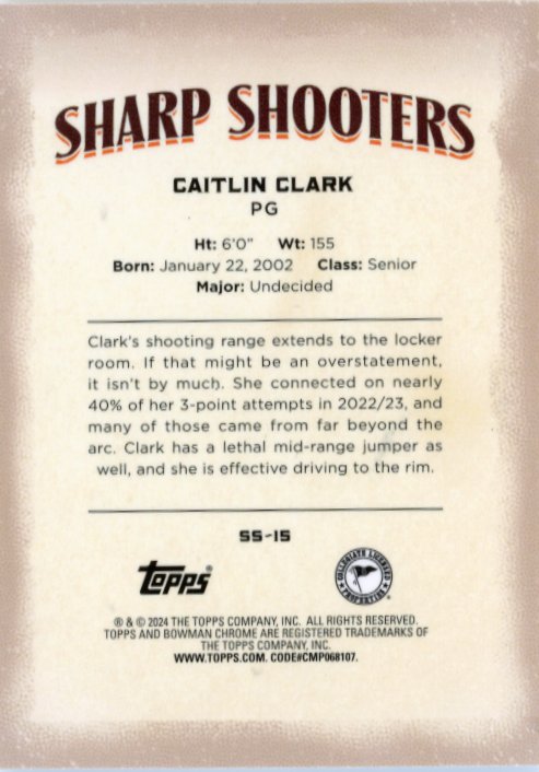 2024 Bowman Chrome U Caitlin Clark #SS-15 - Sharp Shooters Iowa
