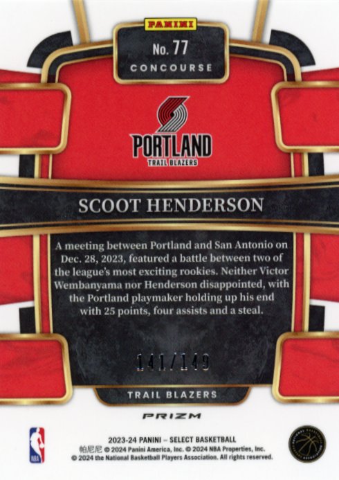 2023/24 Panini Select Scoot Henderson RC #77 - White #/149 Trail Blazers