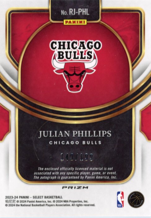 2023/24 Panini Select Julian Phillips RC #RJ-PHL - Silver Autograph Relic Bulls