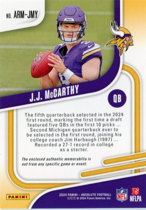 2024 Panini Absolute Rookie Materials JJ McCarthy RC #ARM-JMY - Patch Vikings
