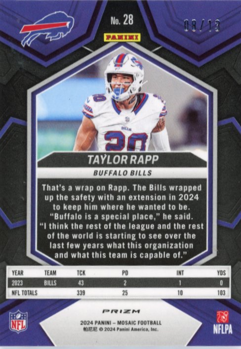 2024 Panini Mosaic Taylor Rapp #28 - Pink Swirl #/13 Bills