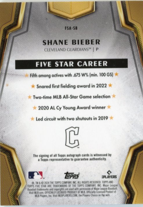 2024 Topps Five Star Shane Bieber #FSA-SB - Autograph Purple #/50 Guardians