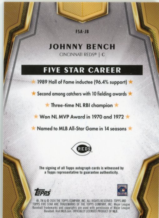 2024 Topps Five Star Johnny Bench #FSA-JB - Autograph Reds
