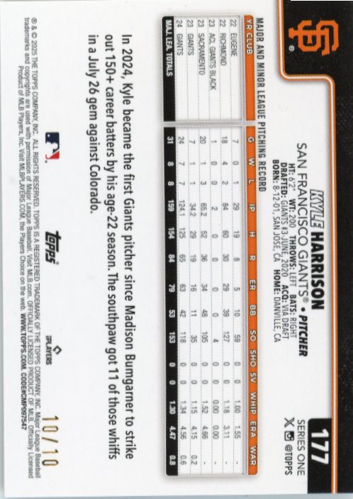 2025 Topps Kyle Harrison #177 - #/10 Black Border Giants