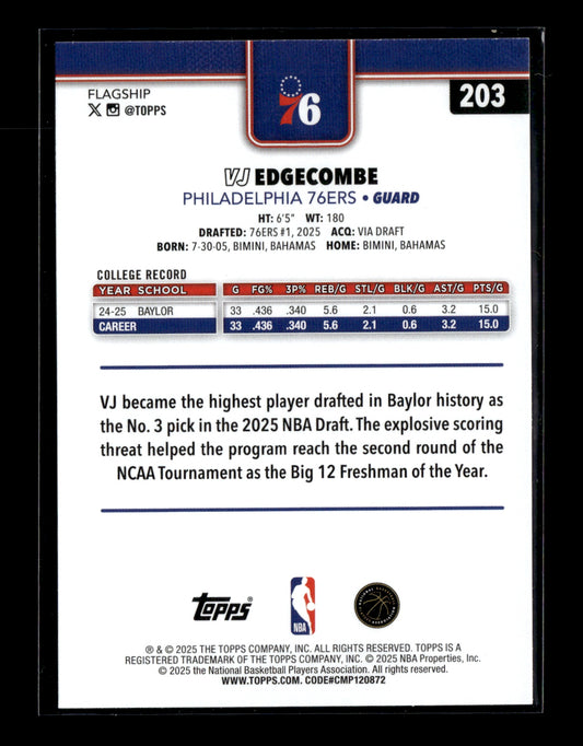 2025-26 Topps #203 VJ Edgecombe Rookie Philadelphia 76ers