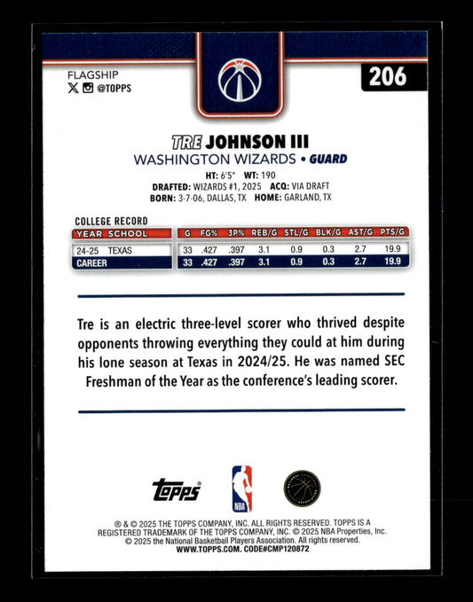 2025-26 Topps #206 Tre Johnson III Rainbow Foilboard Rookie Washington Wizards
