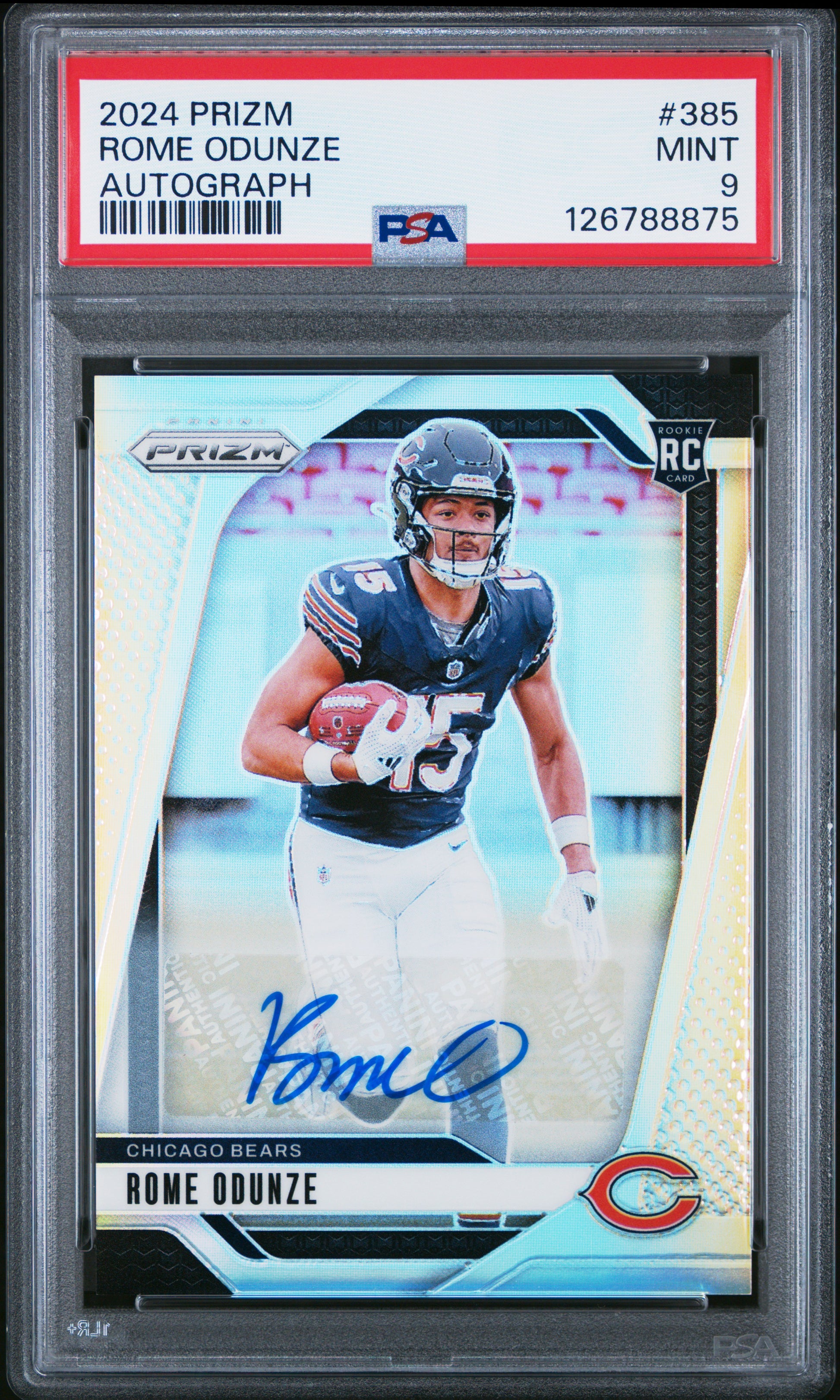 Player: Rome Odunze Team: Chicago Bears Set: 2024 Panini Prizm Card Number: #385 Parallel/Insert: Autograph Serial Numbered: Grade: PSA 9